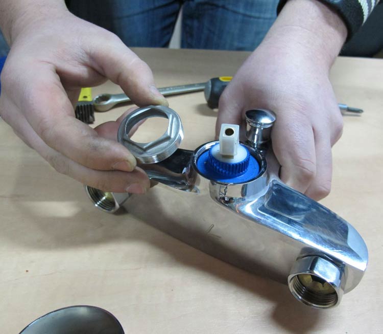 - إذا تبين أن صنبور الخلاط هو مصدر التسرب ، فإننا نزيل الصمام ، ثم نطلق صندوق الرافعة ، متبوعًا باستبدال الحشوات ، وكذلك إغلاق الخيط بشريط دخان. بعد ذلك ، يتم وضع صندوق الرافعة في مكانه. ومع ذلك ، إذا كان سبب التسرب هو فشل صندوق الرافعة ، فيجب استبداله.