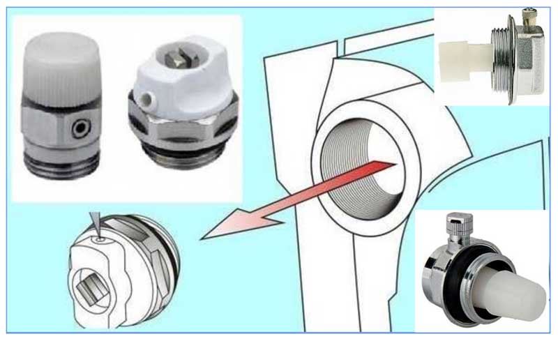 تدل الممارسة على أنه من المستحيل عزل شبكة تسخين المياه بشكل مثالي عن البيئة الخارجية. يخترق الهواء المبرد بطرق مختلفة ويتراكم تدريجيًا في أماكن معينة - الزوايا العلوية للبطاريات ، ومنعطفات الطرق السريعة وأعلى النقاط. بالمناسبة ، يجب أن يكون الأخير مزودًا بصمامات تصريف أوتوماتيكية موضحة في الصورة (فتحات تهوية).