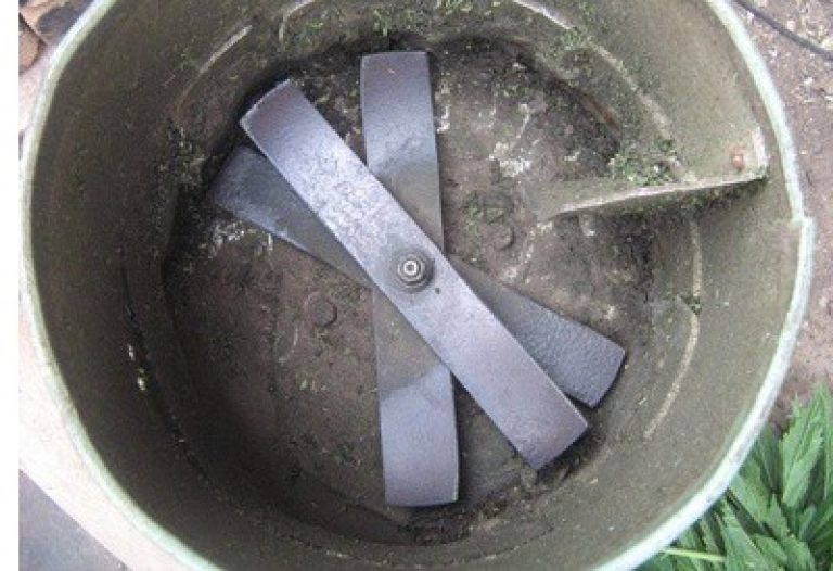 - كجسم قطع ، يتم استخدام الألواح المعدنية (2 أو أكثر) ، والتي يتم توصيلها بقرص المحرك عن طريق براغي طويلة وغسالات مانعة للتسرب. إذا سمح طول البراغي ، يمكنك عمل مستويين من السكاكين ، مما يحسن التكسير.