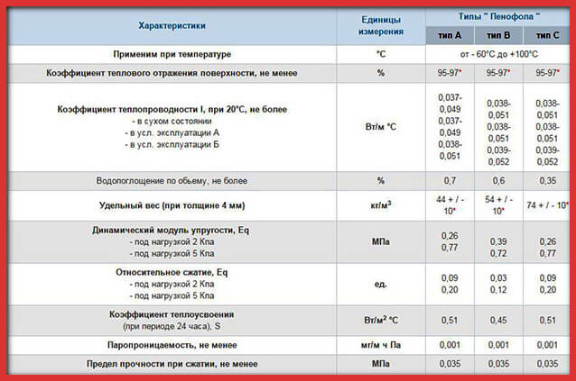 تحتوي المادة على خصائص مقاومة للماء ، فضلاً عن الموصلية الحرارية المنخفضة. بعض أنواع Penofol ، على سبيل المثال ، منتجات من النوع "A" شديدة التخصص ، وهي مناسبة للغرف ذات درجة حرارة الغرفة المتوسطة.