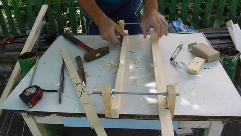 الطول الإجمالي للهيكل 850 ملم. يتم تثبيت الشرائط الأفقية على شكل حرف G. الأقسام من الحافة إلى الشرائط الرأسية - 130 مم. يبلغ ارتفاع القضبان الرأسية فوق مستوى الهيكل بأكمله 100 مم. يتم اختيار هذا الارتفاع بحيث يمر الخيط عند وضع الطوب بمقدار 15 مم فوق الشرائح الرأسية ولا يتداخل مع استخدام التركيبات. لتثبيت أشرطة عمودية داخل الجهاز ، ستحتاج إلى تحديد حزوزين في شريط أفقي 11x25 مم بإزميل. جميع الأجزاء الخشبية مصنوعة من خشب الصنوبر الملصق. لمنع امتصاص الرطوبة من المحلول ، يتم طلاء السطح بالورنيش. ملحوظة: بمساعدة الأزرار المجنحة ، يمكنك ضبط عرض الهيكل والعمل مع طوب أعرض أو أضيق. الجزء الداخلي ثابت بإحكام ، فقط الجانب الخارجي للجهاز يمكن أن يتحرك.