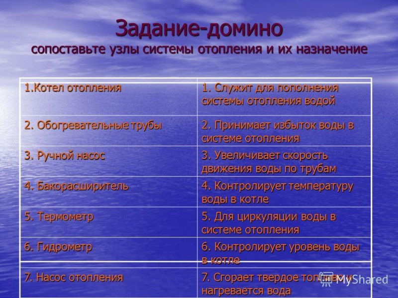 تتطابق مهمة Domino مع عقد نظام التدفئة والغرض منها 1. تسخين غلاية 1. يعمل على تجديد نظام التسخين بالماء 2. أنابيب التسخين 2. يأخذ الماء الزائد في نظام التدفئة 3. مضخة يدوية 3. تزيد من سرعة الماء الحركة عبر الأنابيب 4. موسع الخزان 4. يتحكم في درجة حرارة الماء في الغلاية 5. مقياس الحرارة 5. لتدوير المياه في نظام التدفئة 6. مقياس السوائل 6. يتحكم في مستوى الماء في الغلاية 7. مضخة التدفئة 7.حرق الوقود الصلب والماء مع ارتفاع درجات الحرارة