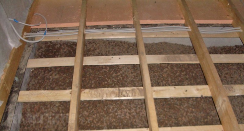 - تمتلئ مادة العزل بين القضبان. في هذه الحالة ، من الضروري مراعاة وجود فجوة بين العزل والأرضية النهائية للتهوية.