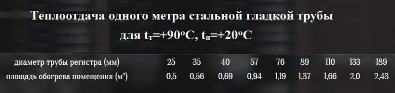 يجب ألا تكون المسافة بين الأنبوبين في السجل صغيرة: فهذا يقلل من انتقال الحرارة. لذلك ، فهي تقع على مسافة لا تقل عن نصف قطرها 1.5. يعتمد عدد الصفوف وطول السجل على الطاقة المطلوبة ، وكذلك على قطر الأنابيب المختارة. في الحالة العامة (بالنسبة لوسط روسيا ، للغرف ذات العزل الحراري المتوسط وارتفاع السقف 3 أمتار) ، يمكن حسابها من خلال نقل الحرارة لمتر من الأنابيب الفولاذية. هذه القيم موضحة في الجدول. باستخدامه ، يمكنك العثور على حجم وعدد السجلات حسب مساحة الغرفة.