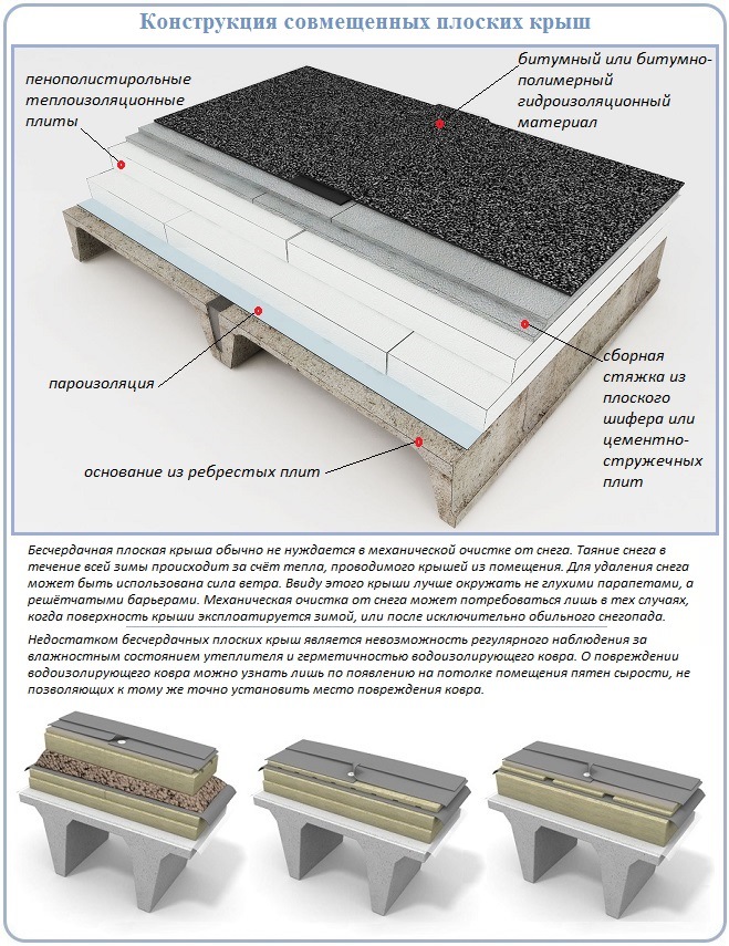 ، فهي أيضًا غير مجدية. هيكل سقفهم مدمج مع السقف. يتم الاحترار عن طريق وضع عازل حراري مع طبقات مصاحبة أعلى القاعدة. تتمثل ميزة الأنظمة المدمجة في أنها لا تحتاج عمليًا إلى إزالة الغطاء الثلجي في فصل الشتاء. بعد كل شيء ، يتم تسخين السقف بانتظام من الداخل. يتم التخلص من الرواسب الثلجية الصغيرة بسهولة من خلال القوة الطبيعية للرياح ، ولهذا السبب يوصى بتجهيز هذه الأسطح ليس بالحواجز ، ولكن بأسوار شبكية. العيب: من الصعب مراقبة حالة السقف. سوف ينعكس أدنى ضرر في التسريبات ، يليها ترميم جدي لفطيرة التسقيف. -