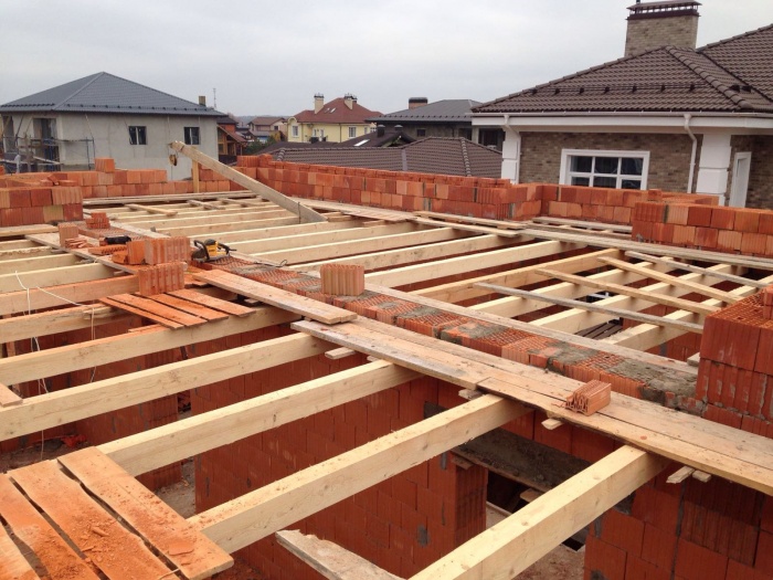วัสดุที่ใช้กันทั่วไปในการติดตั้งส่วนต่อประสานหลังคาและวัสดุปูพื้นคือไม้ โดยเฉพาะในอาคารส่วนตัว เนื่องจากวัสดุนี้แปรรูปง่าย เป็นมิตรกับสิ่งแวดล้อม ติดตั้งง่ายและรวดเร็ว ข้อ จำกัด เกี่ยวกับความยาวของช่วงพื้นไม้ - แปดเมตร องค์ประกอบรับน้ำหนักหลักคือแท่งที่มีขนาดหน้าตัด 5 × 15 ซม. (ขั้นต่ำ) และ 14x240 (สูงสุด) บางครั้งใช้ไม้ขัดที่มีขนาดเส้นผ่านศูนย์กลางที่เหมาะสมเพื่อทำคาน ต้นสนหลายชนิดใช้สำหรับทับซ้อนกันเนื่องจากทนทานที่สุด ก่อนการติดตั้งโครงสร้างไม้จะต้องแห้งสนิท